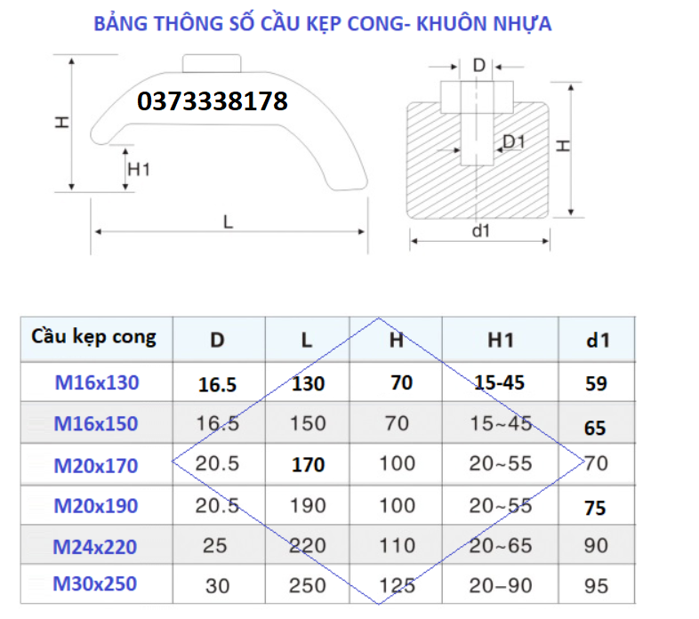 - Các kích thước kẹp khuôn hình cầu như bảng bên dưới: