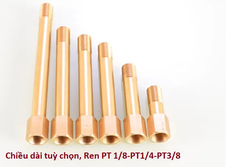 Dài 50mm-100mm-120mm-150mm-200mm- 250mm với 2 kiểu ren nước cơ bản là ren PT 1/8 (9.6mm) và ren PT 1/4 (13mm).