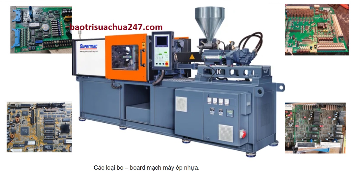 Bo mạch máy ép nhựa máy ép nhựa có rất nhiều board khác nhau: Board màn hình, board điều nhiệt, board bàn phím, board điều khiển, board áp tốc, board nguồn, driver, biến tần...